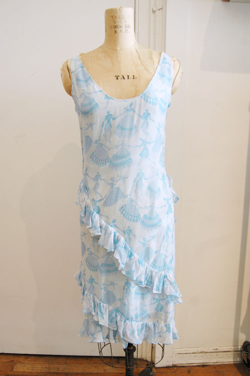 Look closely at this silk Jill Stuart party dress - it has one of the dreamiest prints we've ever seen! We love the sky blue watercolor dancers. To the right is a Dries Van Noten (SOLD) wrap sweater that somehow combines every color of the rainbow in a harmonious way.