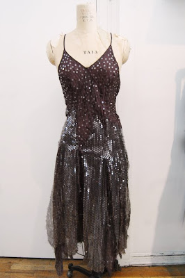 We find that there's something very avant garde about this shiny asymmetrical See by Chloe dress. Perhaps its the fact that they slashed one sleeve & left the other on? There's also pockets. The "dress" to the right is all that & more - a cape, a scarf, trousers...it's a beautiful diaphanous pleated Issey Miyake piece with one large opening (for head, arms, legs...). Its the pieces that keeps on giving!