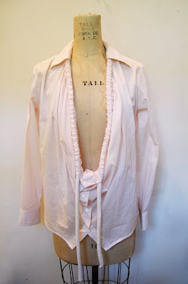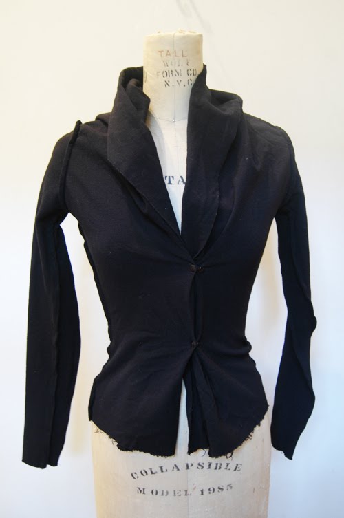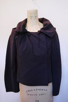 We loved all of the Maison Martin Margiela pieces with oversized drawstring necks, and are now happy to say that we have one here in pastel pink (left). And we never, ever get sick of Marni (SOLD) jackets -this one is navy blue, featuring concealed snaps and a voluminous collar.