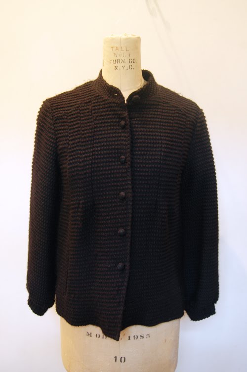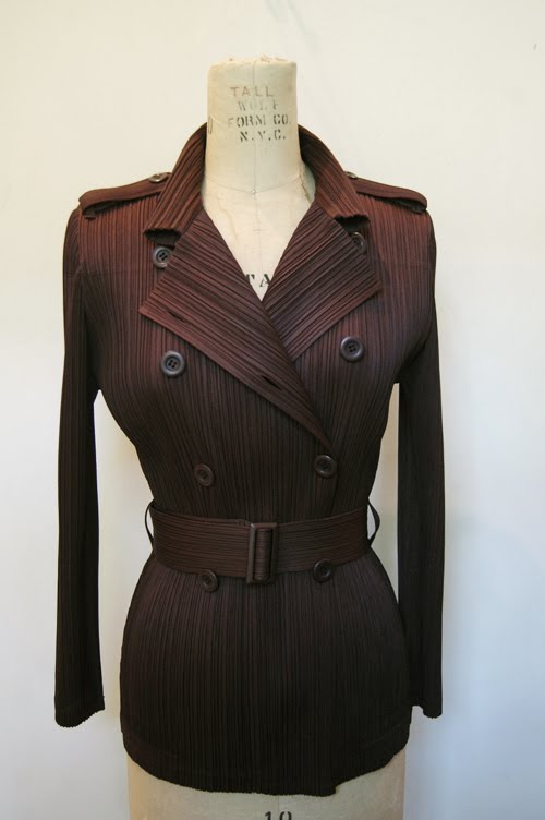 The brown double breasted jacket to the left is initially classic, but once you see the tightly pleated fabric it is very obviously Issey Miyake! The jacket to right is a feminine take on a military blazer by Emporio Armani (SOLD).