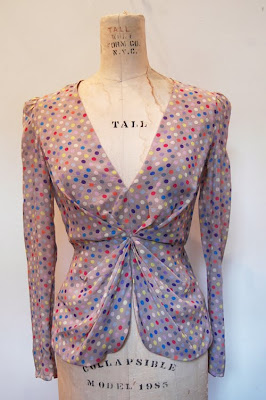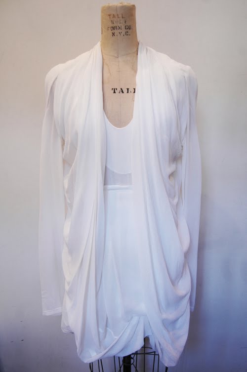 We're obsessed with this equestrian printed Bernhard Willhelm cut-out bustier top (top left), as well as this beautifully constructed polka-dotty Chris Benz blouse (top right) (SOLD). The gray numbers below are equally playful - the Hoss dress to the left has all sorts of ties and baubles to keep you entertained, and really - could the Tsumori Chisato sweatshirt dress be any more FUN?